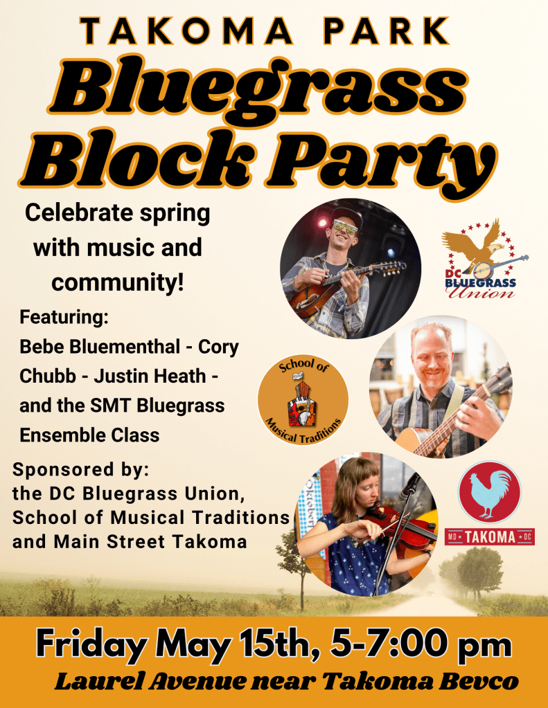 I’m excited to be partnering with the DC Bluegrass Union, School of Musical Traditions, and Main Street Takoma to put on the first ever Takoma Park Bluegrass Block Party! We will be closing Laurel Avenue between Carroll and Eastern for a celebration of fine bluegrass picking, high lonesome harmonies, and community centered music. Food and drinks are available from Takoma Bevco, Kinda, Pizza Movers, and other nearby restaurants and there are picnic tables and covered areas where you can eat, listen, and meet the neighbors.