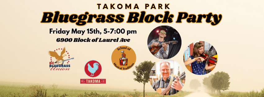 I’m excited to be partnering with the DC Bluegrass Union, School of Musical Traditions, and Main Street Takoma to put on the first ever Takoma Park Bluegrass Block Party! We will be closing Laurel Avenue between Carroll and Eastern for a celebration of fine bluegrass picking, high lonesome harmonies, and community centered music. Food and drinks are available from Takoma Bevco, Kinda, Pizza Movers, and other nearby restaurants and there are picnic tables and covered areas where you can eat, listen, and meet the neighbors.